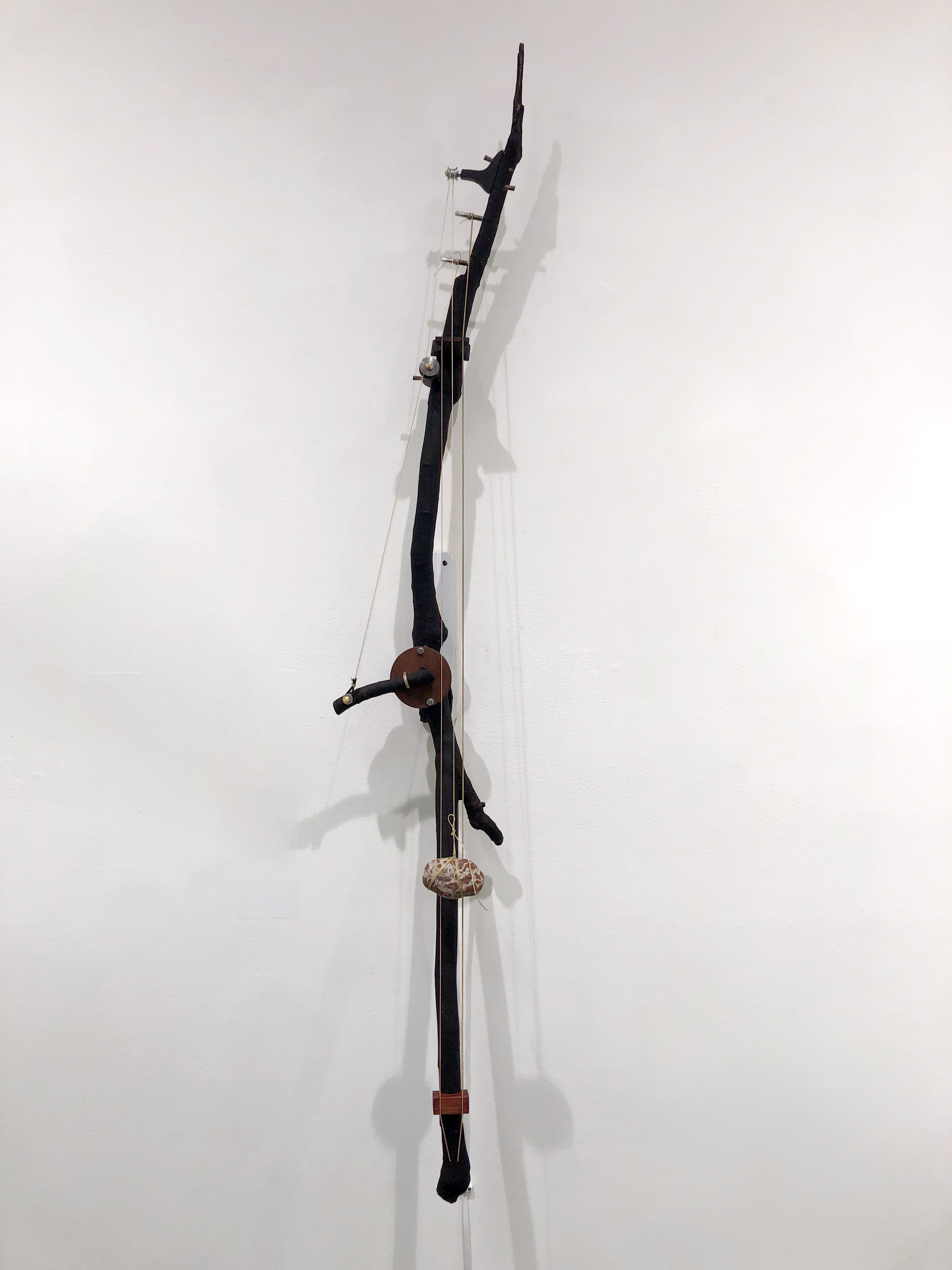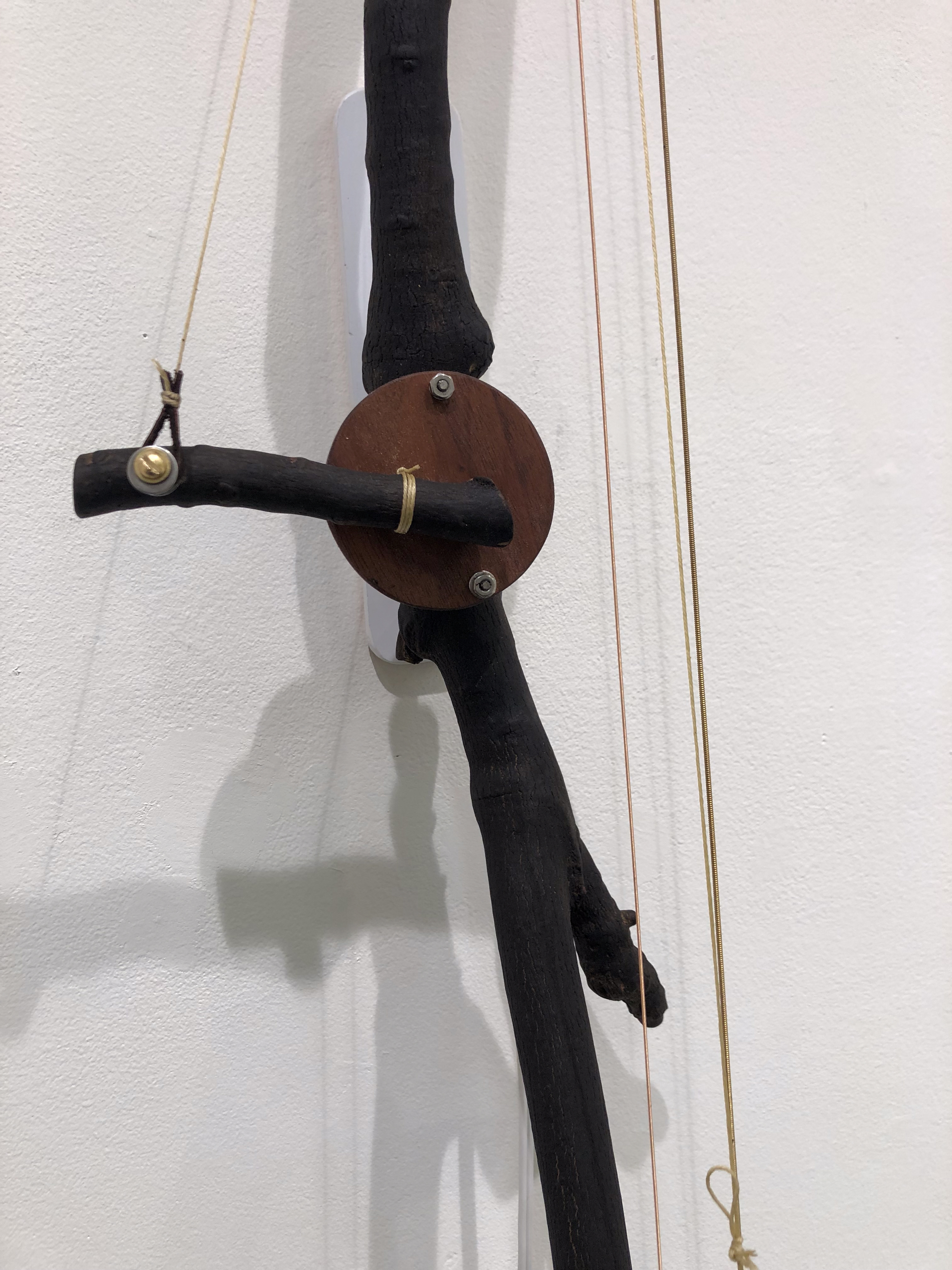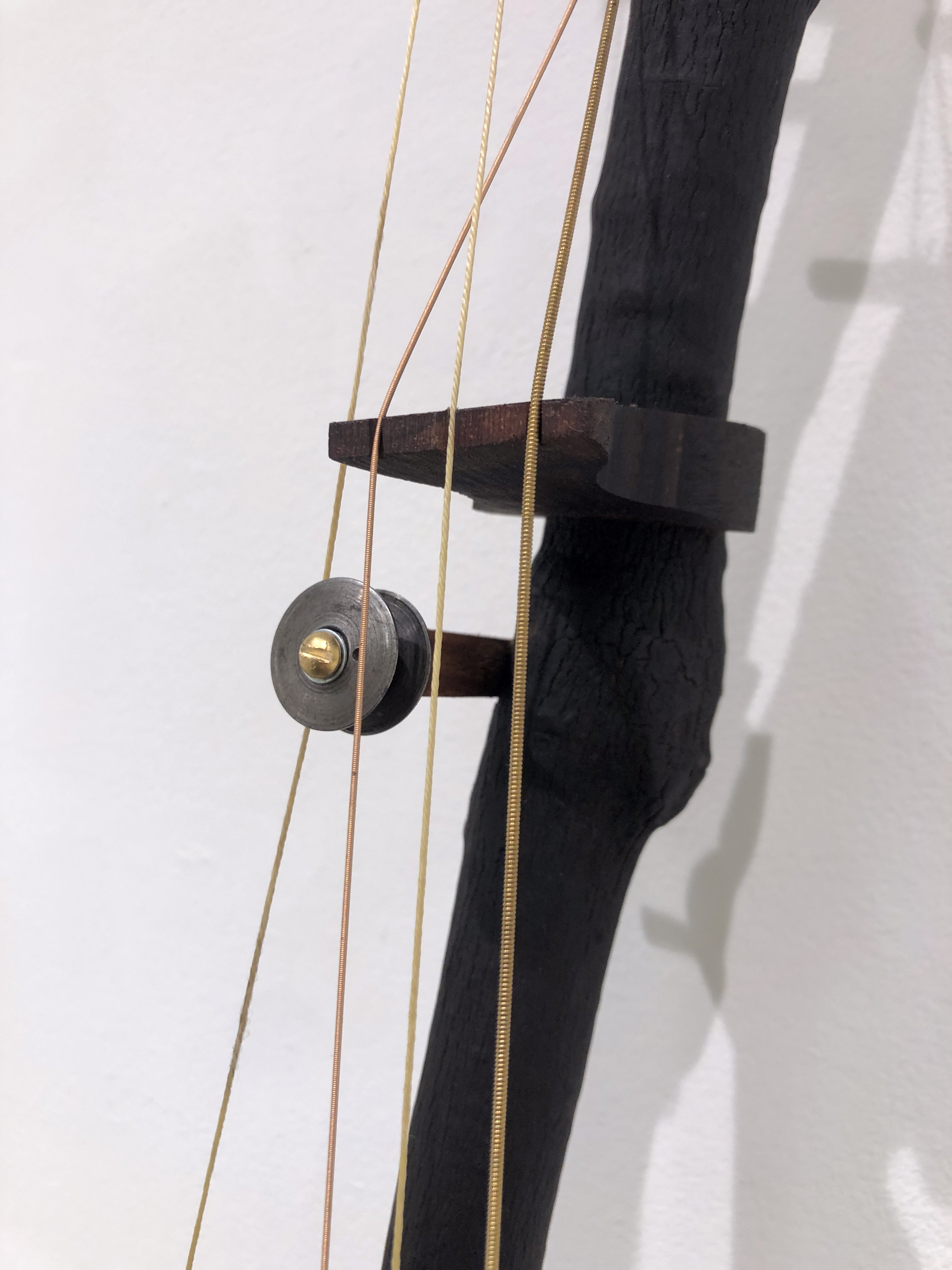 medium: charred elm branch, other hardwood, metal, threads, motor