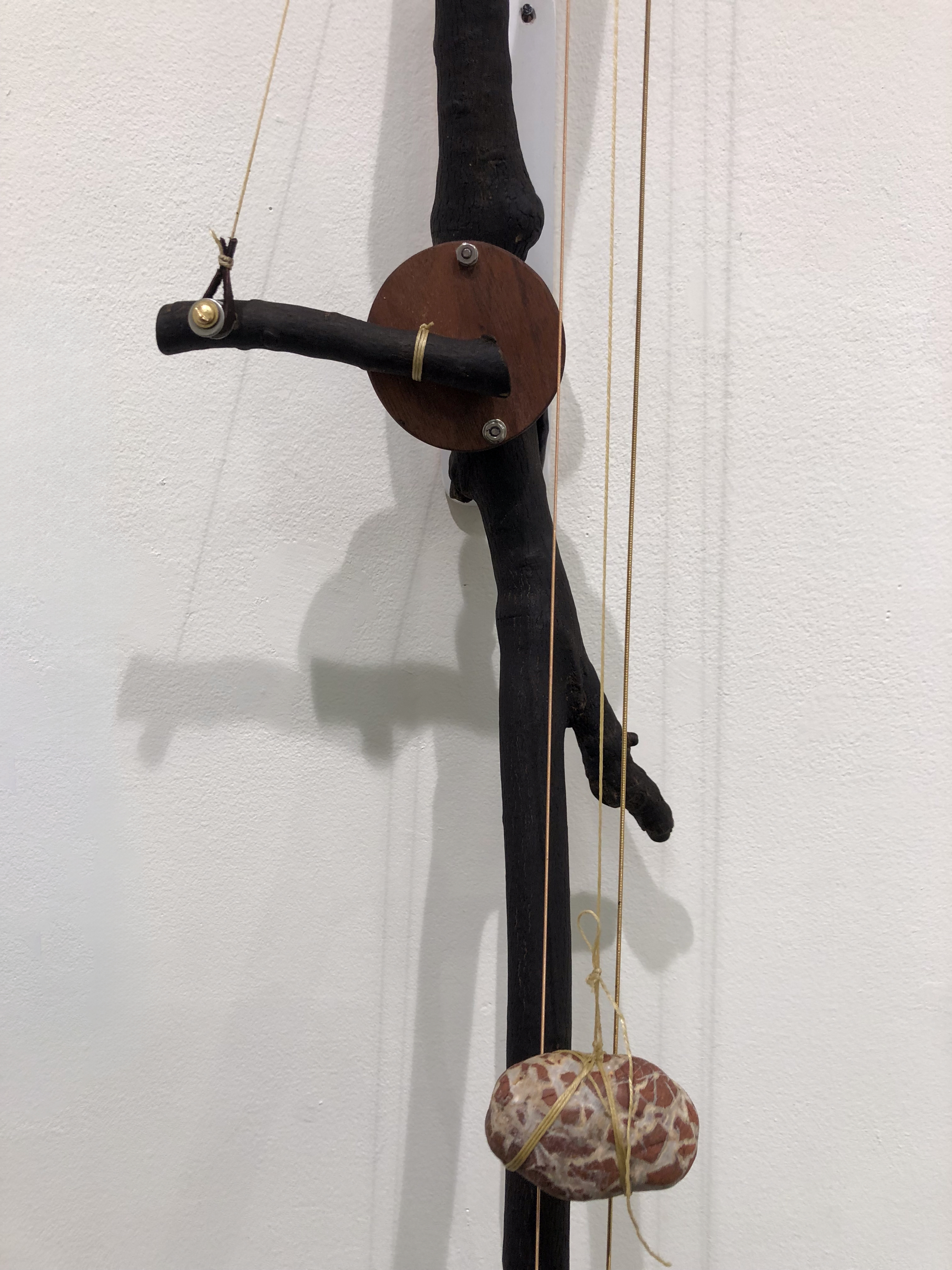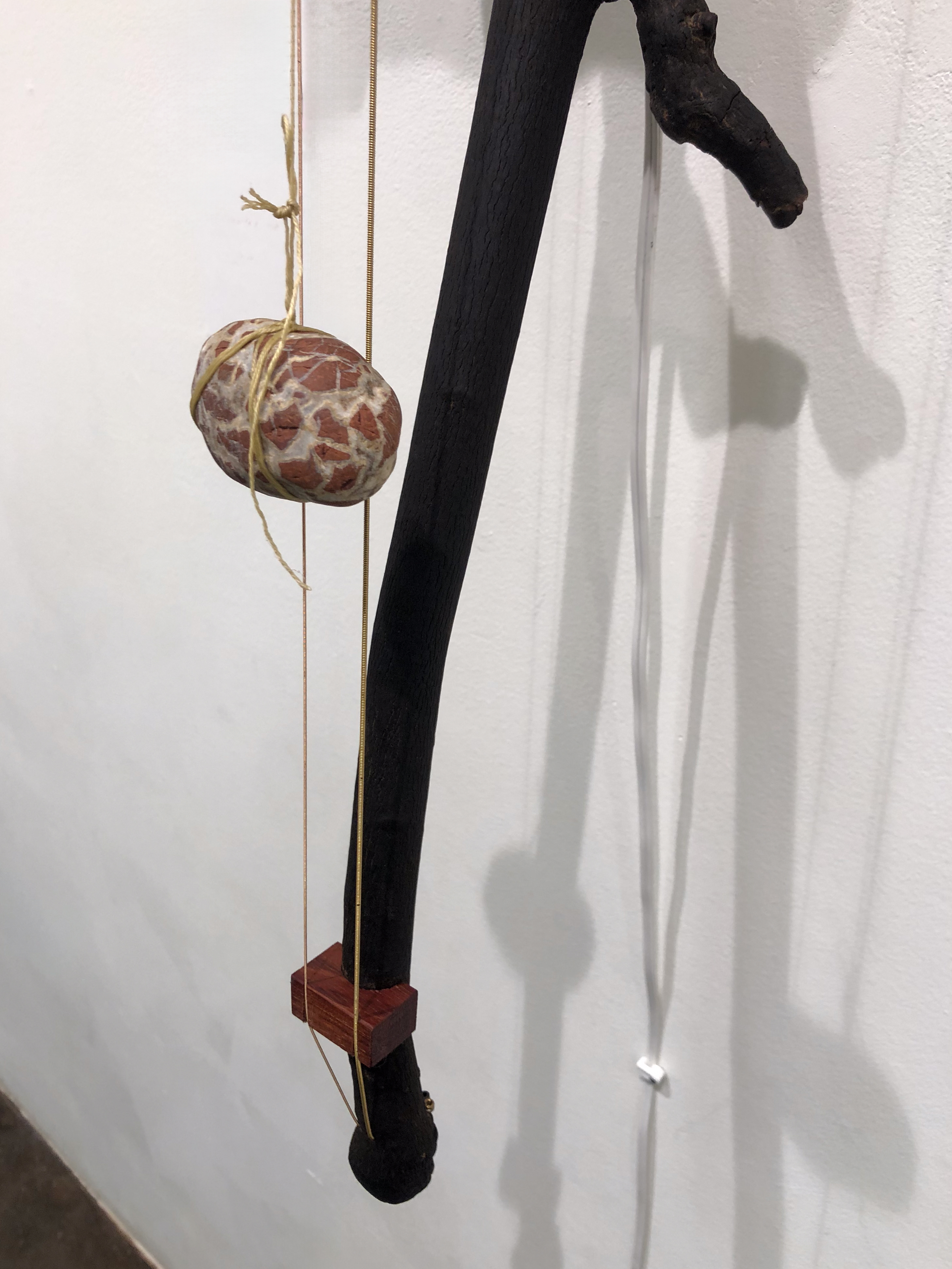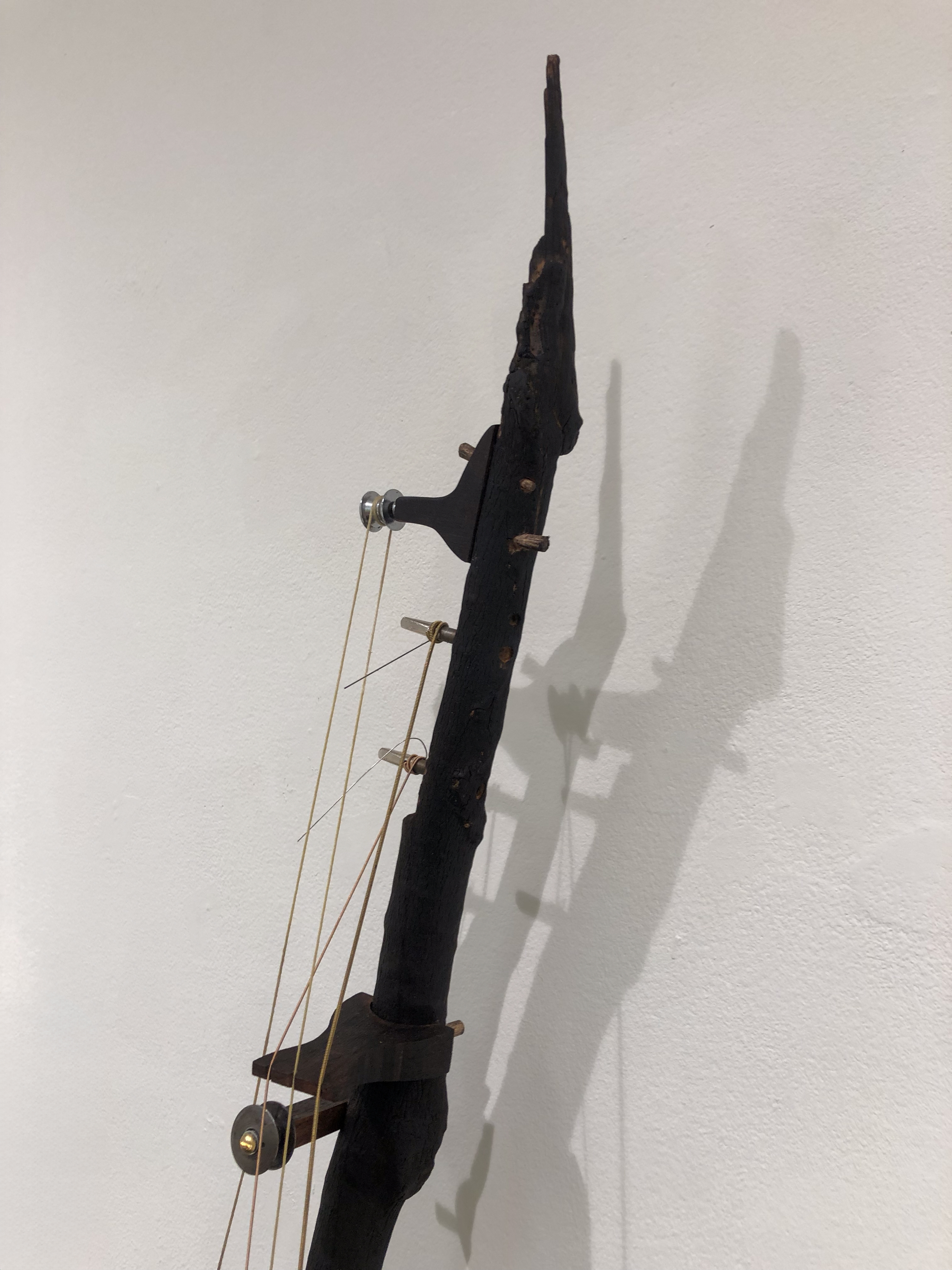 medium: charred elm branch, other hardwood, metal, threads, motor